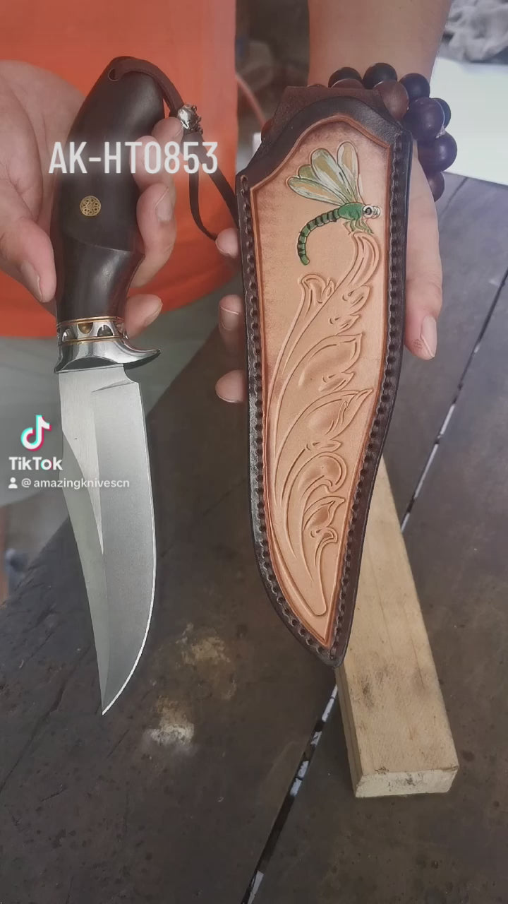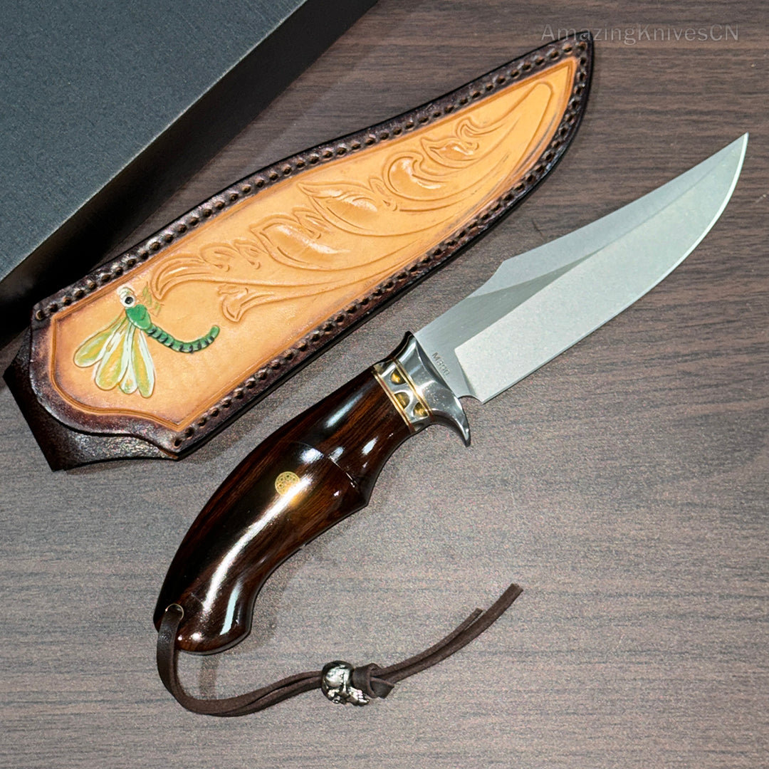 The handle is equipped with top-notch components, including an intricately engraved steel pommel and desert ironwood. Each piece of wood undergoes a rigorous selection and refinement process, resulting in intricate and full patterns that enhance grip comfort. The sheath is crafted from leather with meticulously hand-stitched colored edges. This outdoor knife comes highly recommended and is available in limited quantities, so be sure not to miss out!