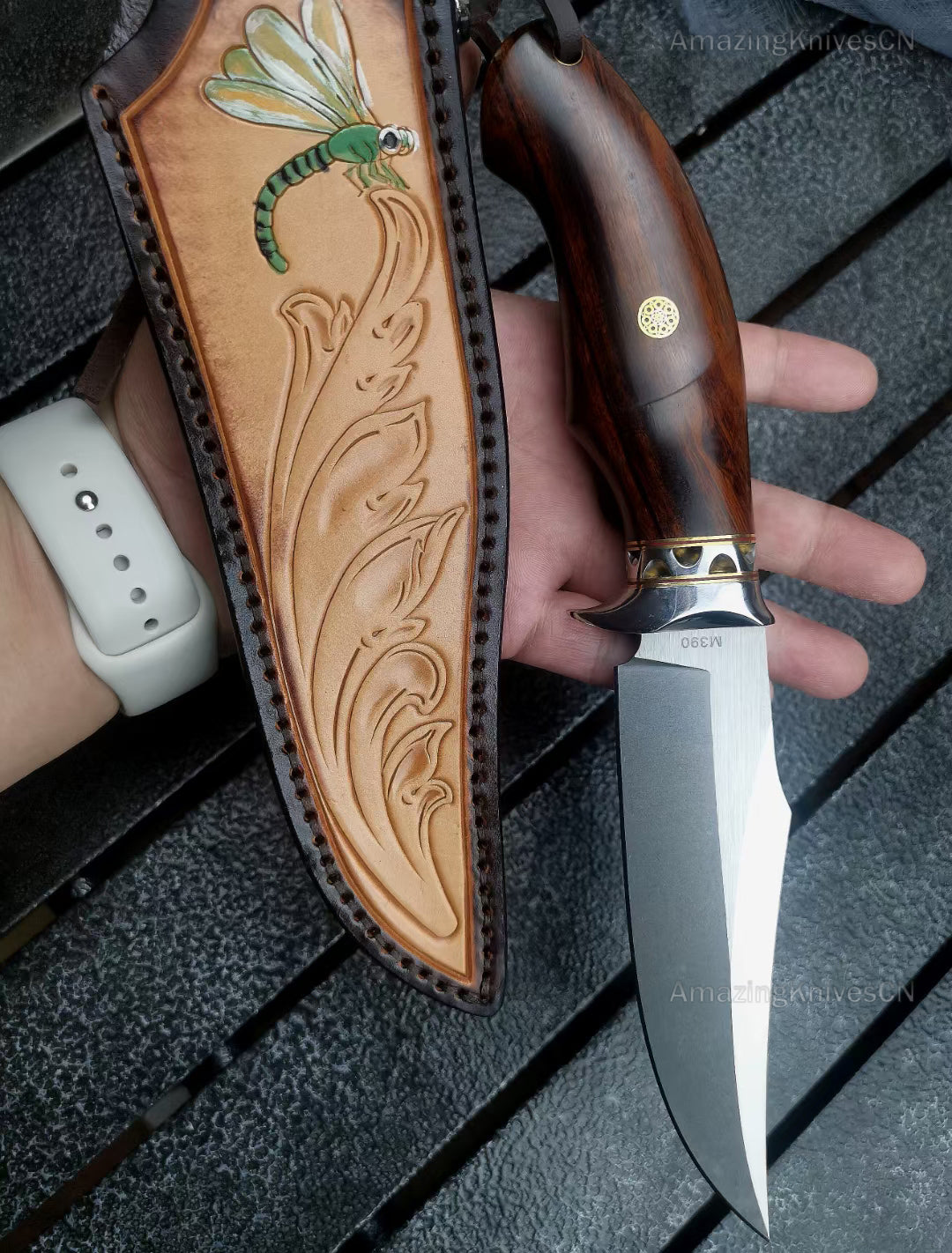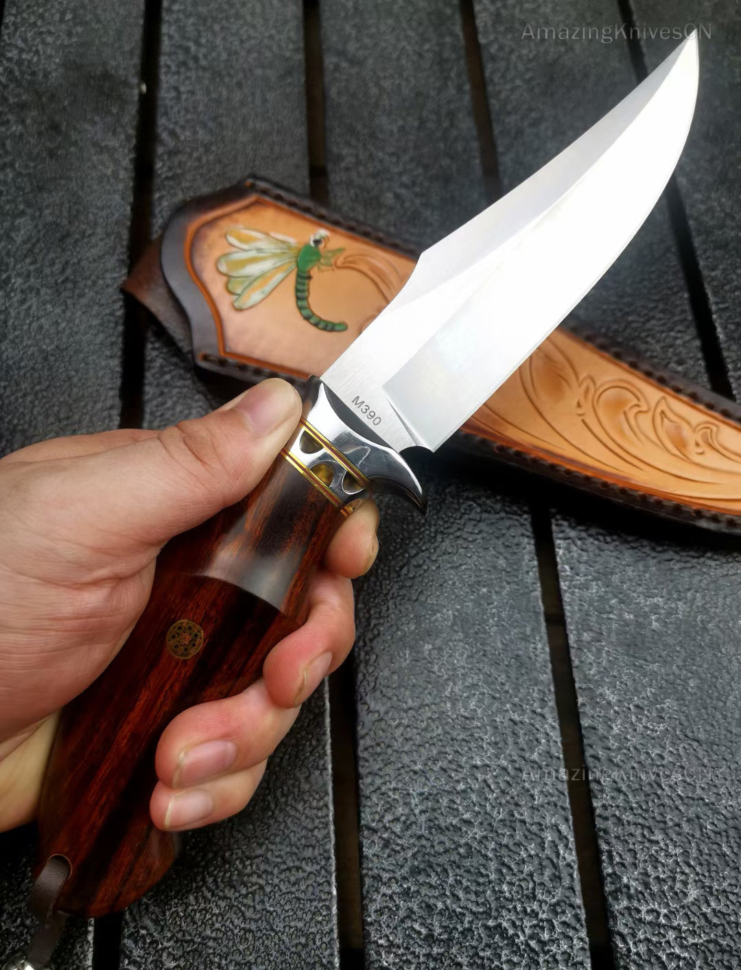 High Quality M390 Steel Bowie Knife Fixed Blade Ironwood Handle with Leather Sheath - AK-HT0853