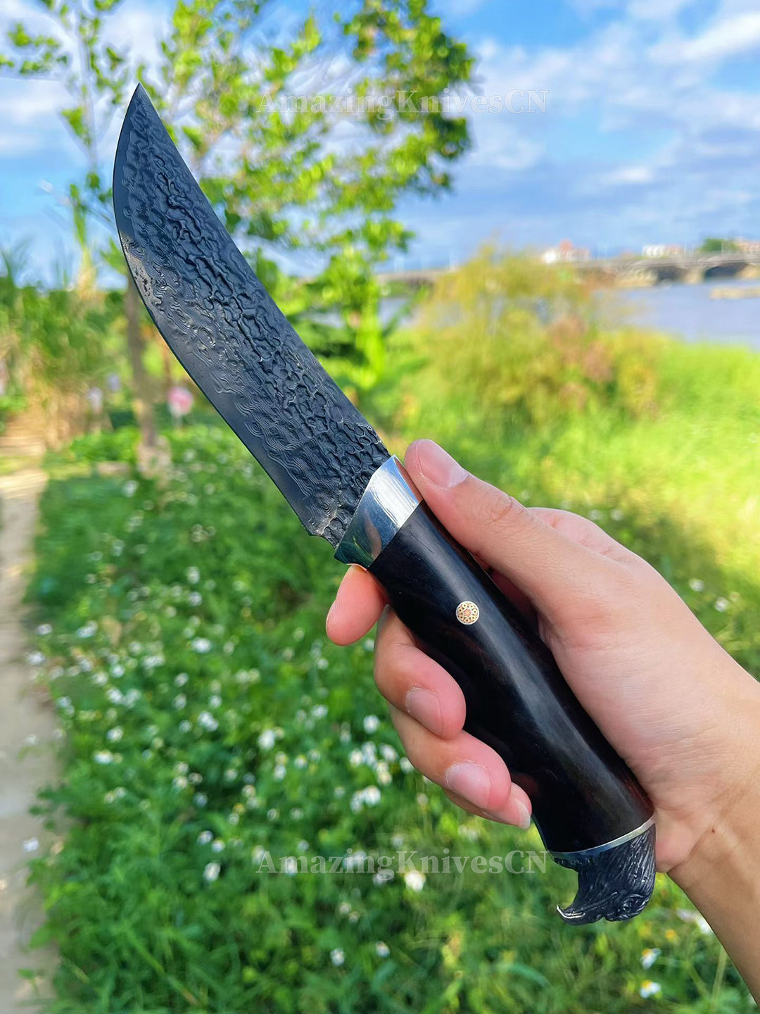 The blade is designed with a sharp, penetrating profile for high performance. The handle is made from aged African ebony, carefully sanded and polished by experienced craftsmen. The ergonomic texture and smooth finish provide an excellent and comfortable grip. Each piece has unique handmade details, making it not just a tool, but a collectible work of art for knife enthusiasts.
