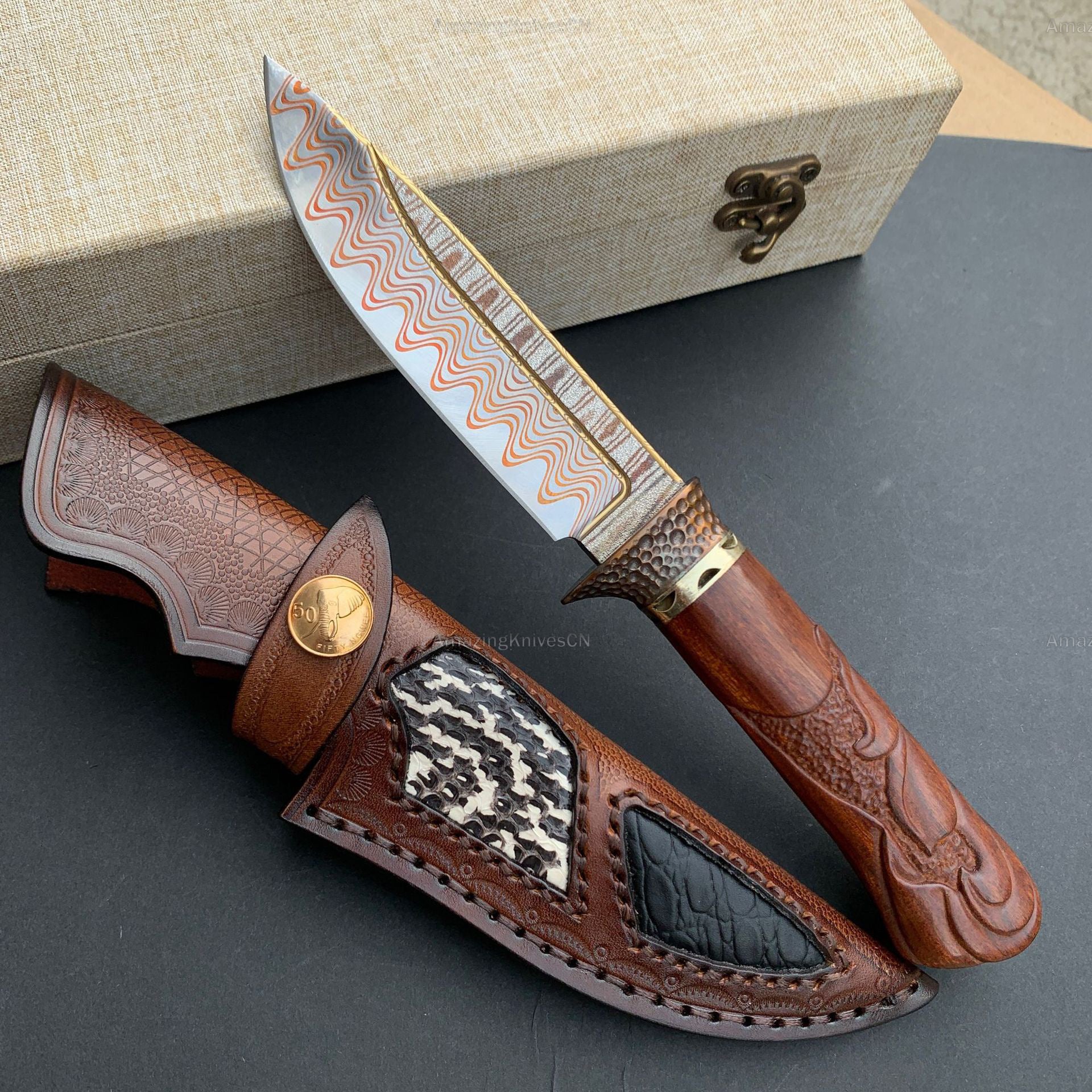 - Sheath: Vegetable-tanned leather snakeskin inlay hand-stitched sheath