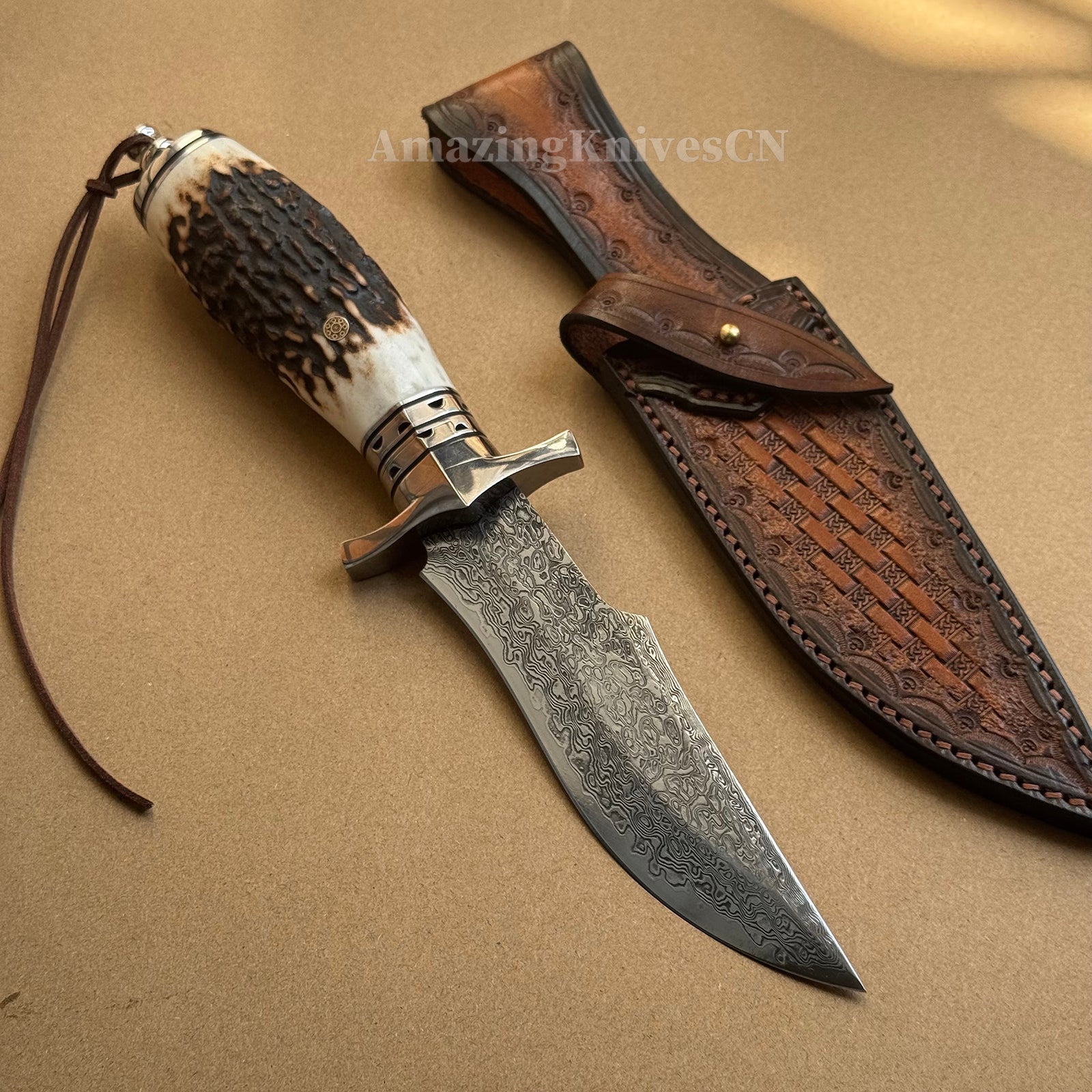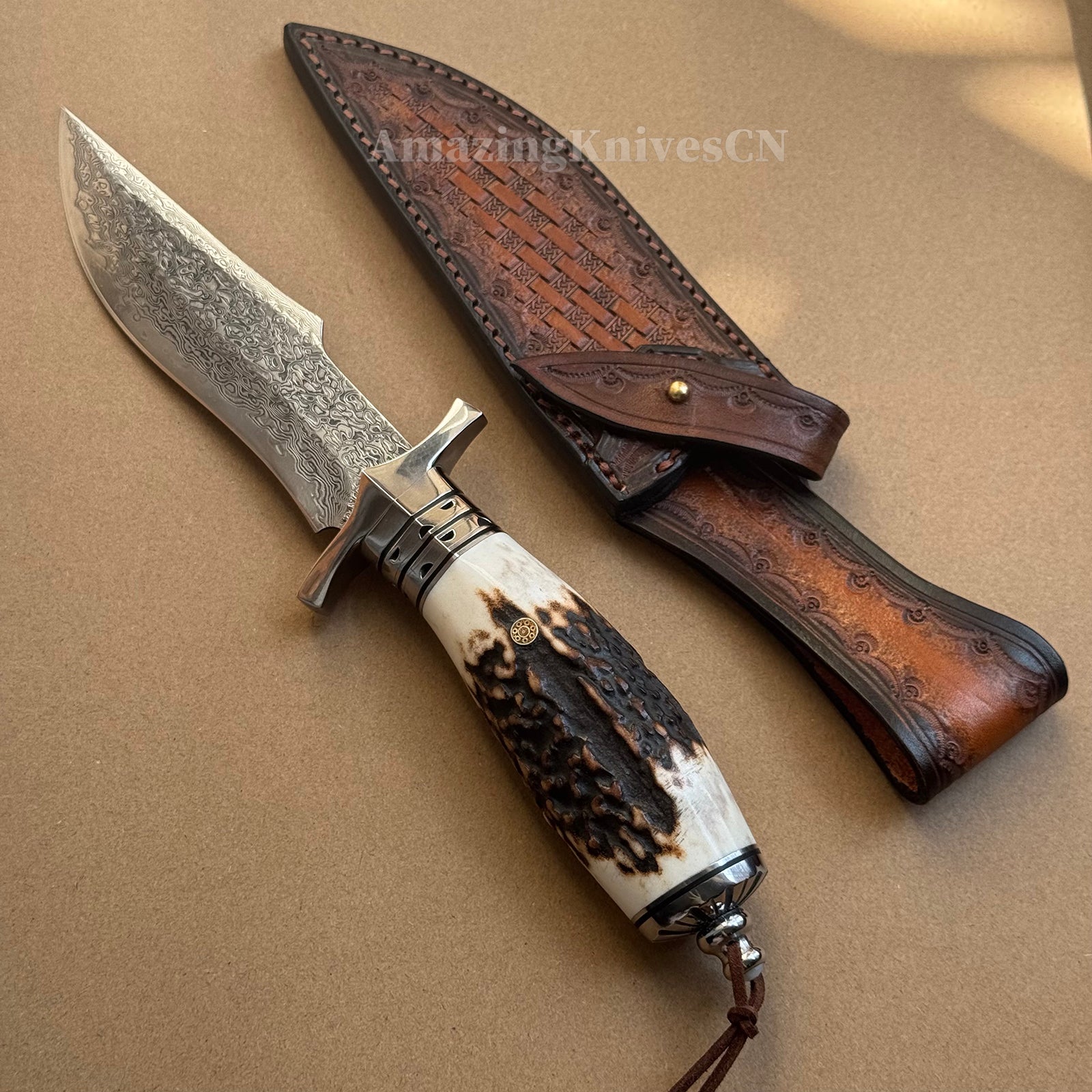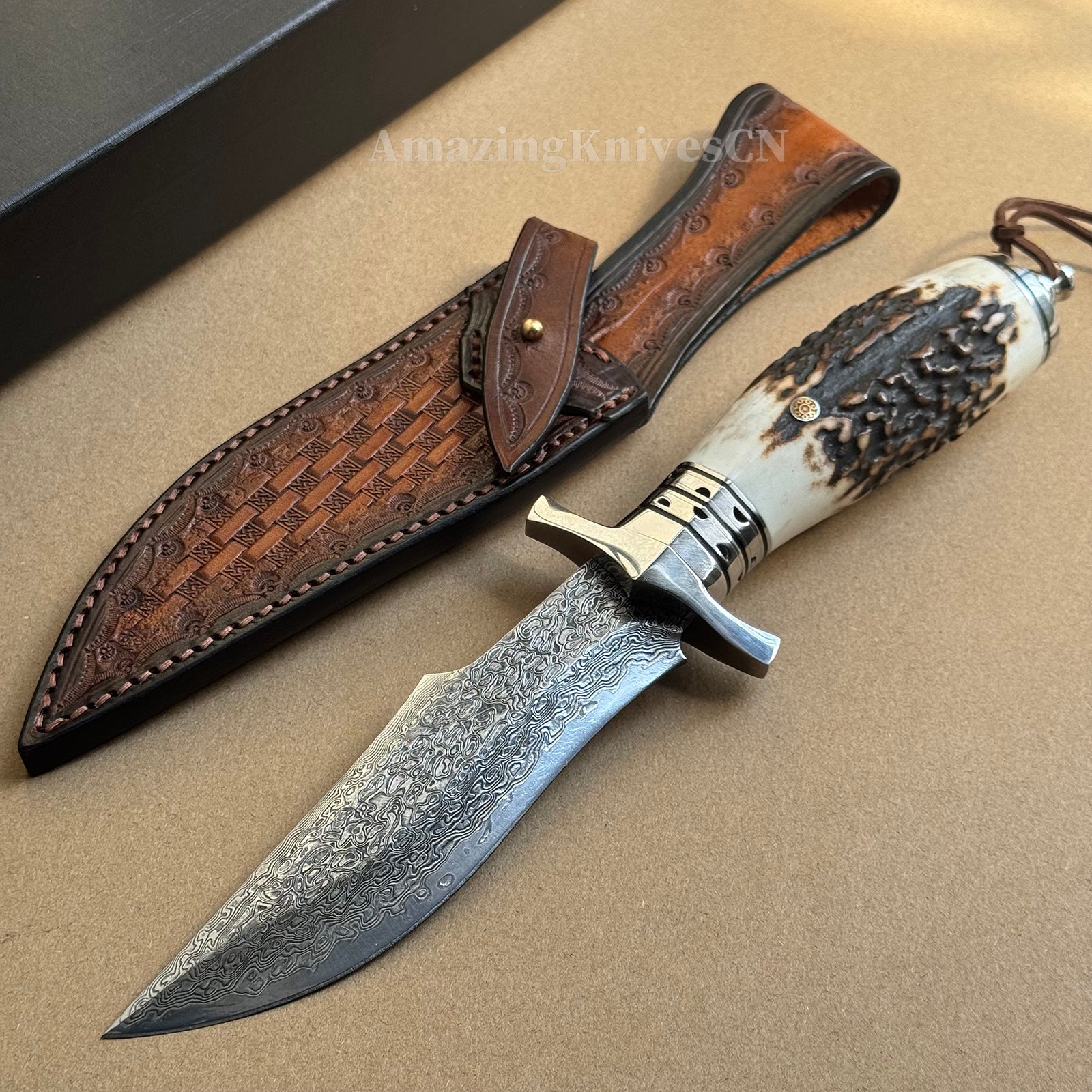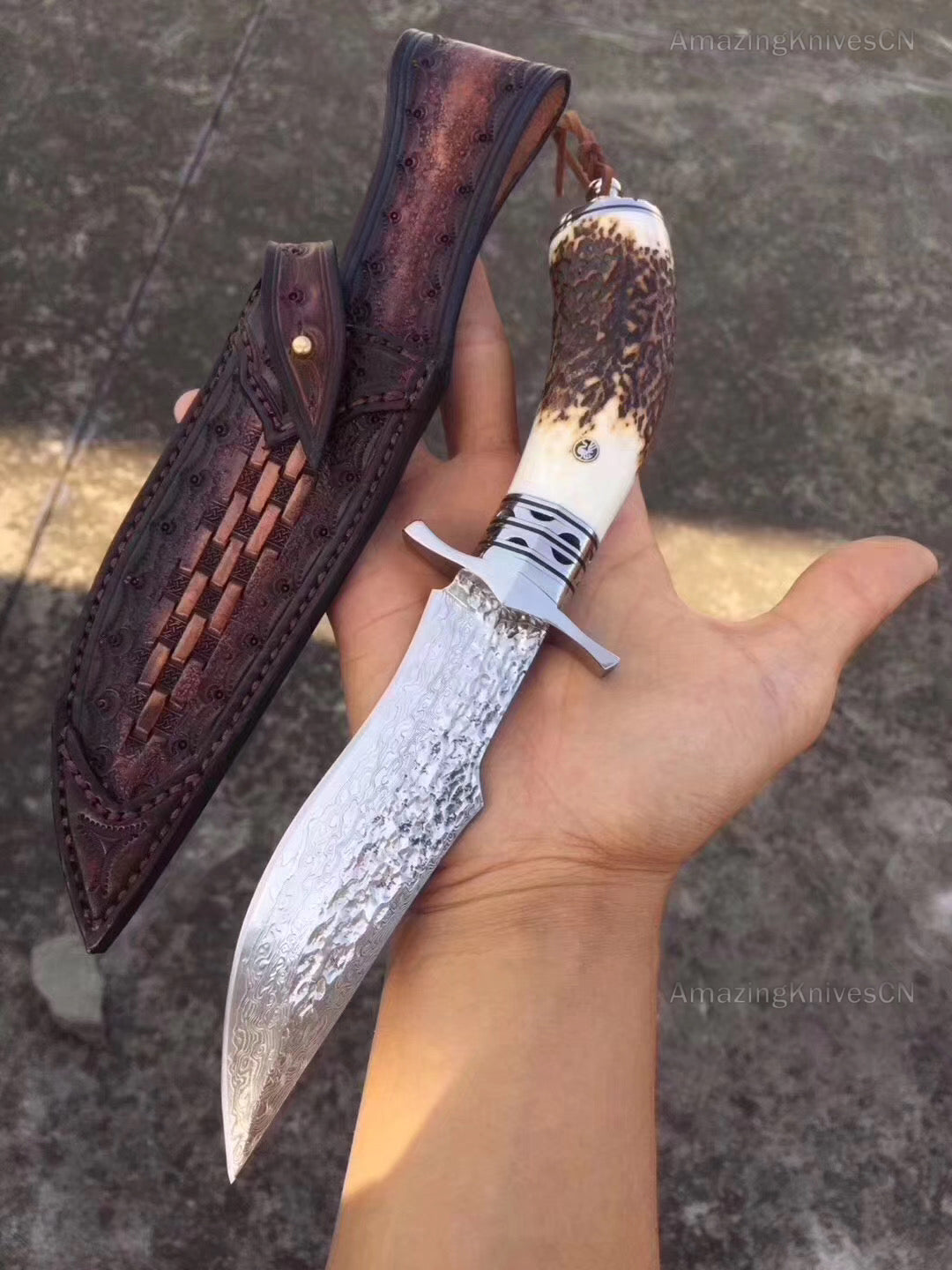 Damascus Survival Outdoor Camping Hunting Knife Fixed Blade Stag Antler Sheath - AK-HT0307