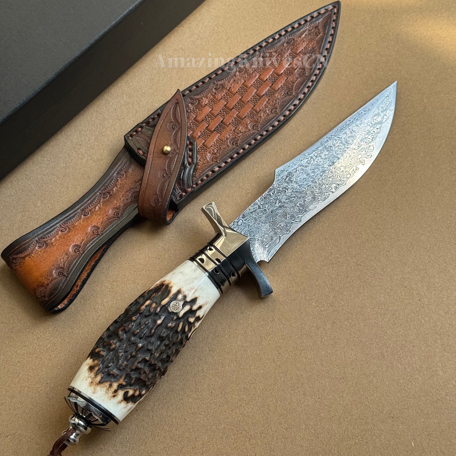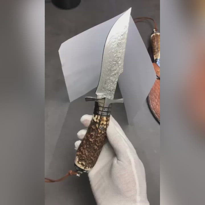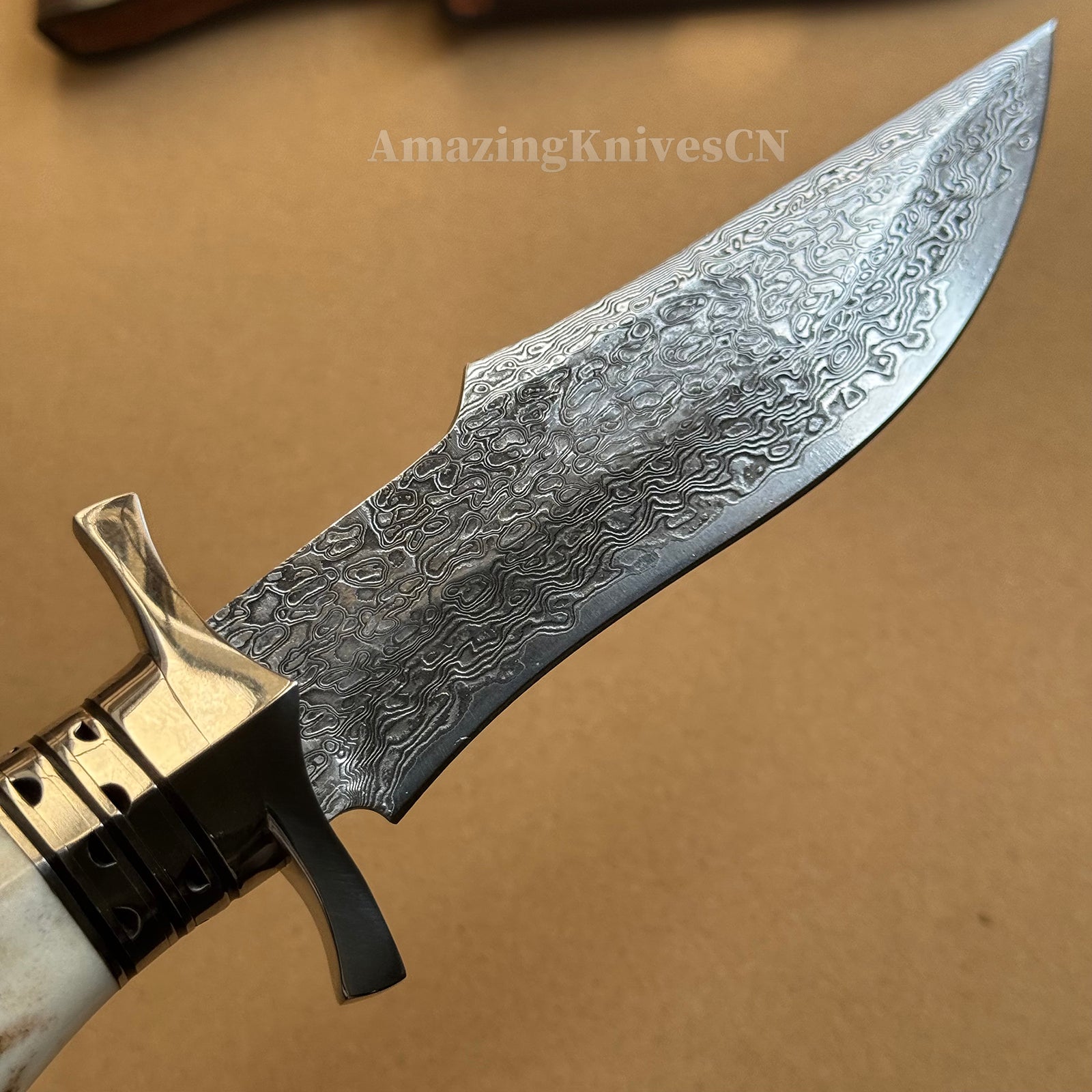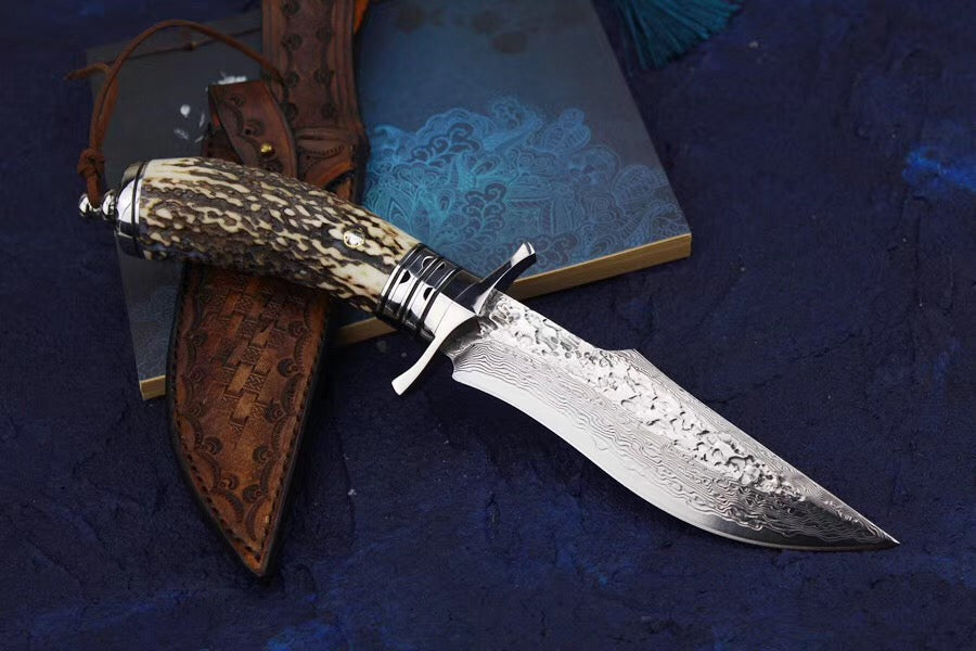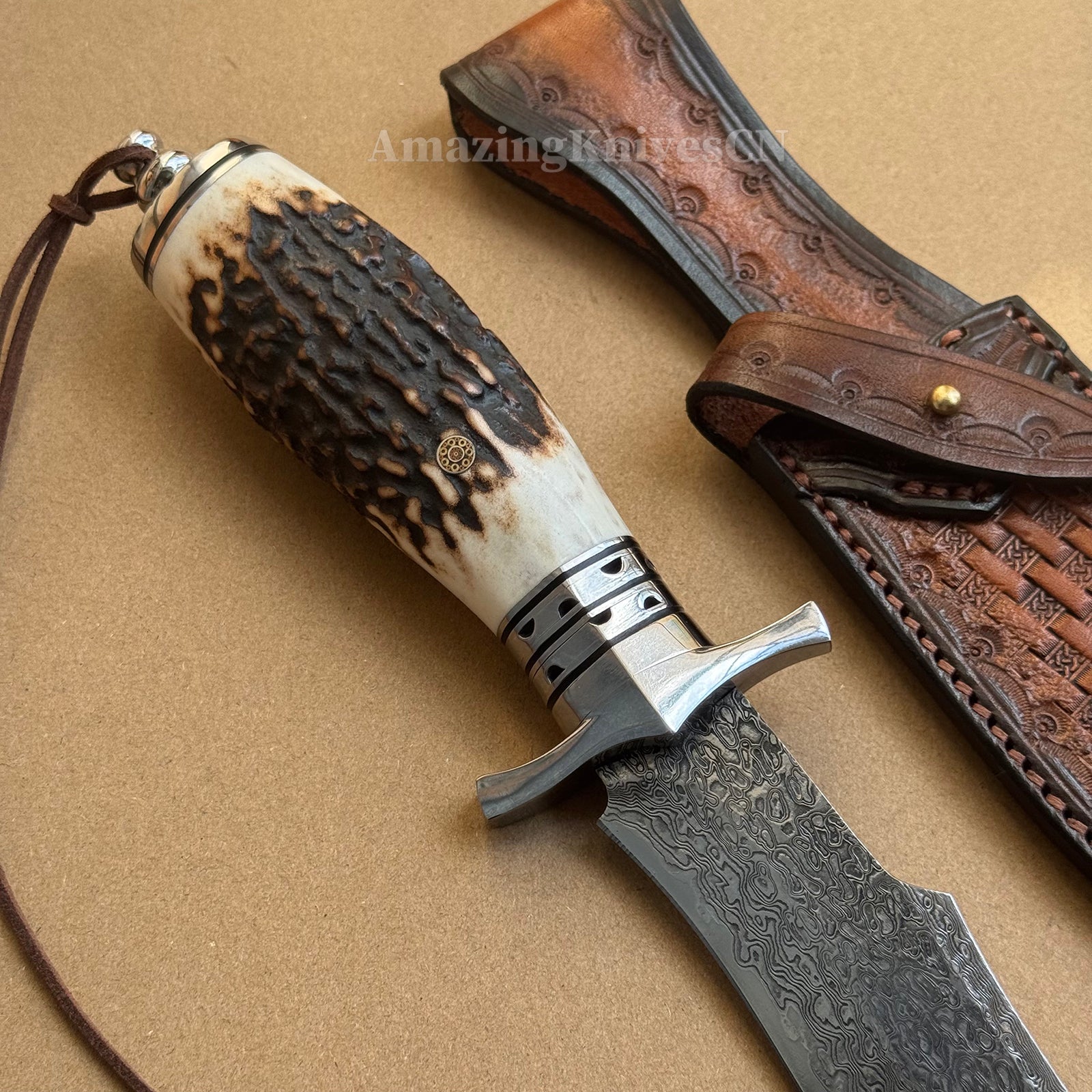 Damascus Survival Outdoor Camping Hunting Knife Fixed Blade Stag Antler Sheath - AK-HT0307
