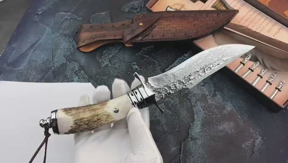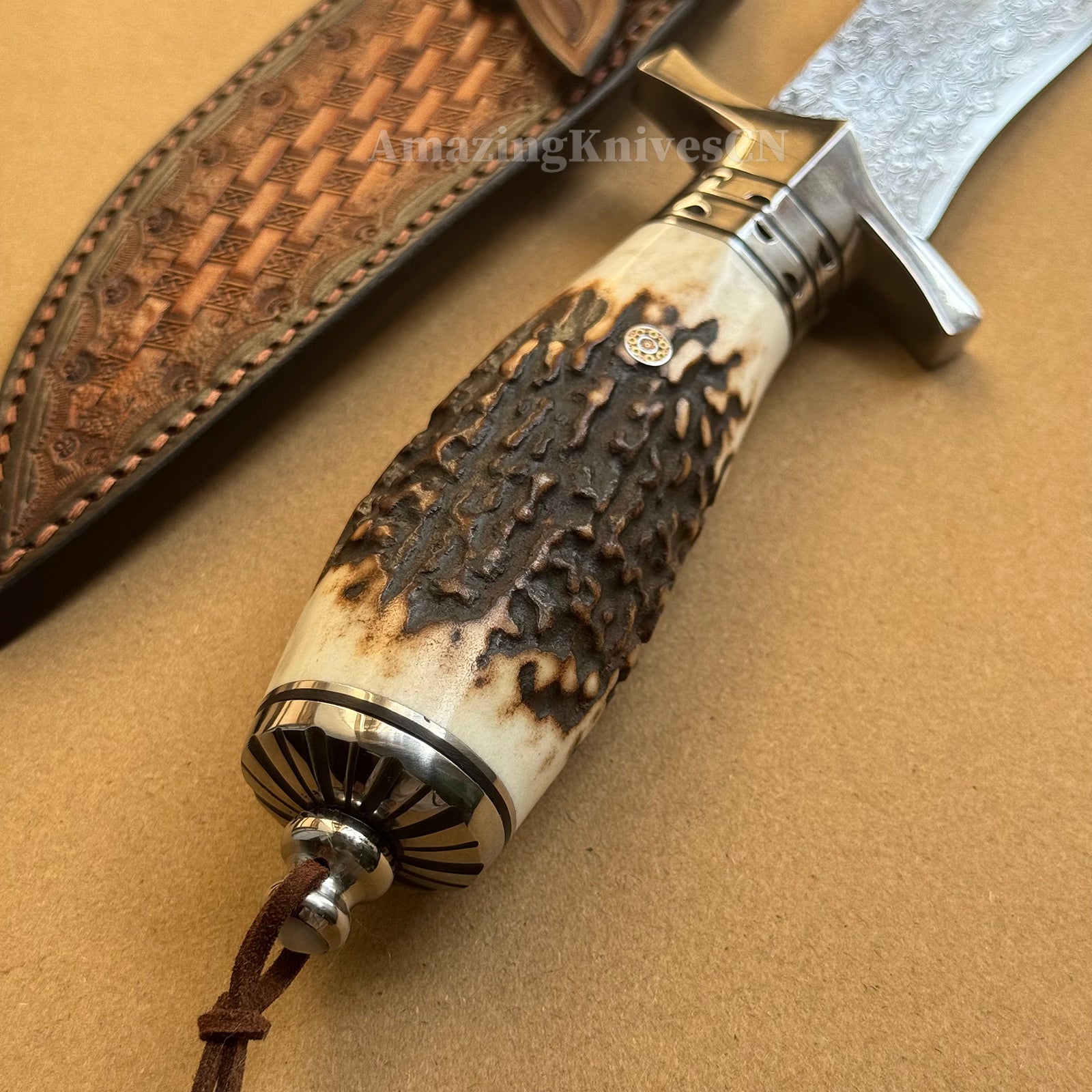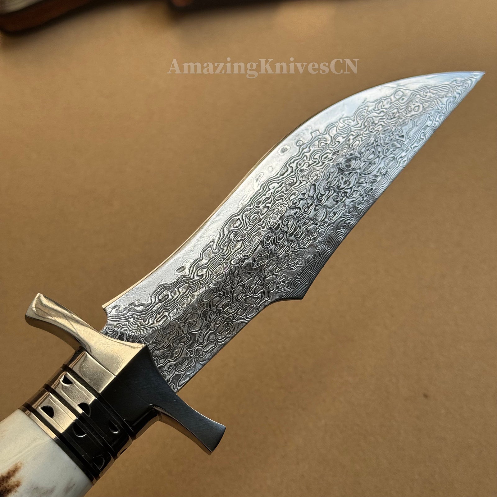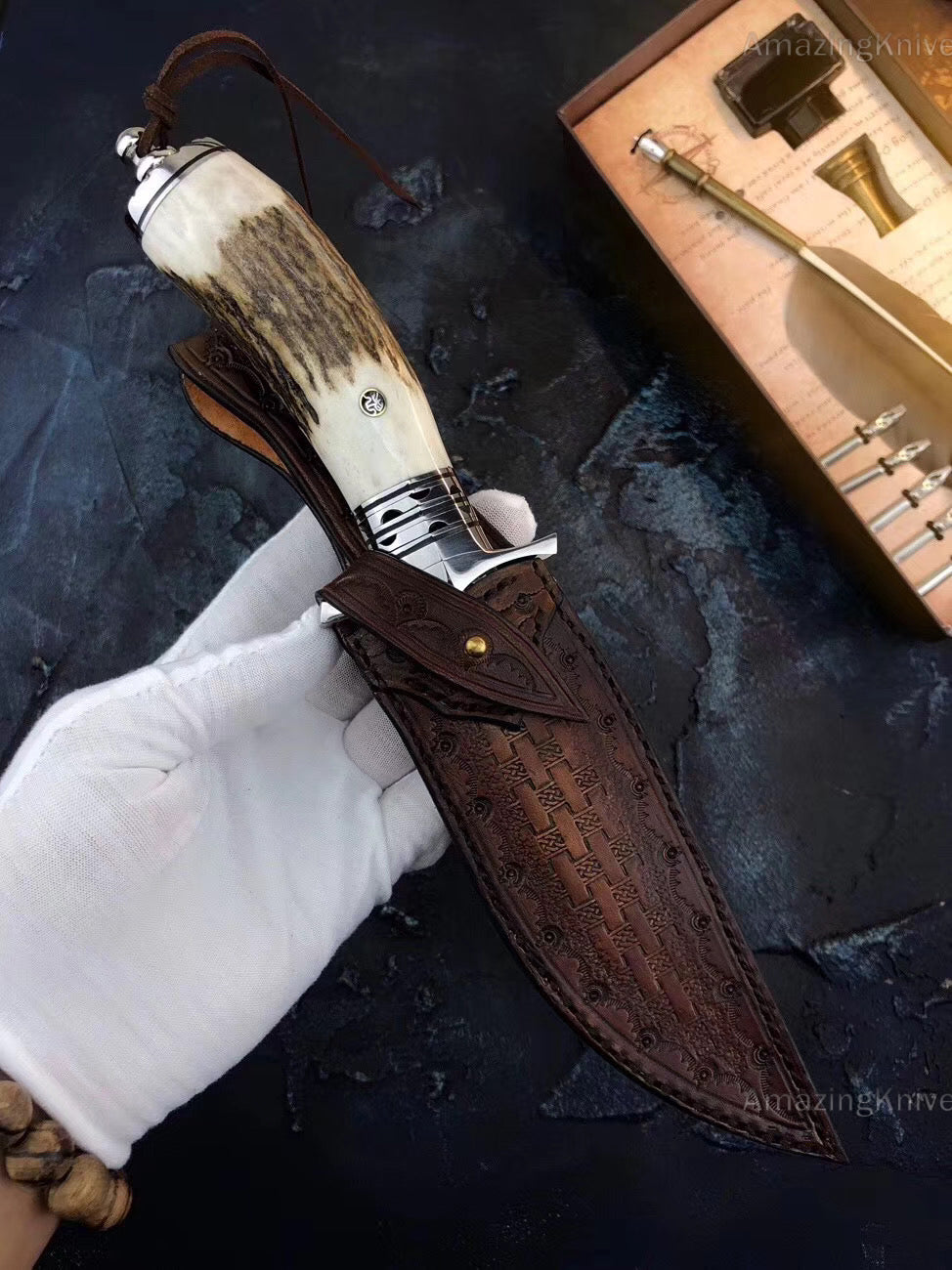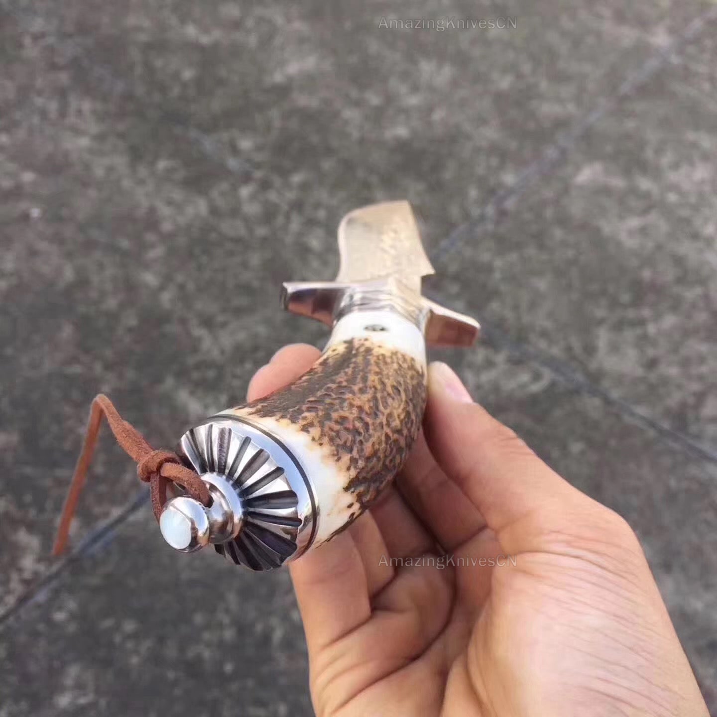 Damascus Survival Outdoor Camping Hunting Knife Fixed Blade Stag Antler Sheath - AK-HT0307