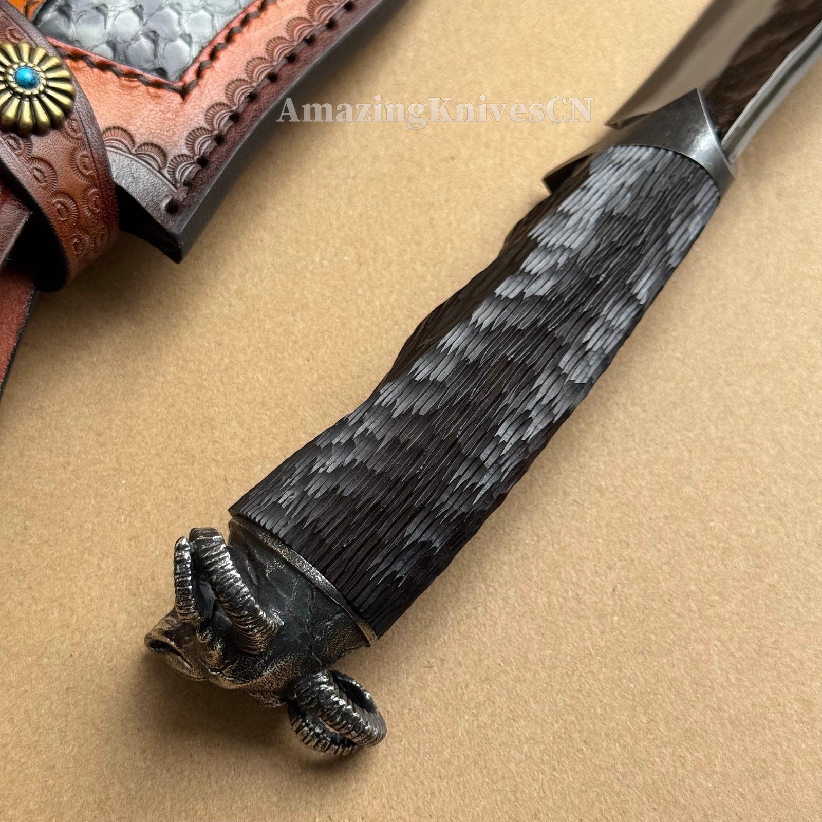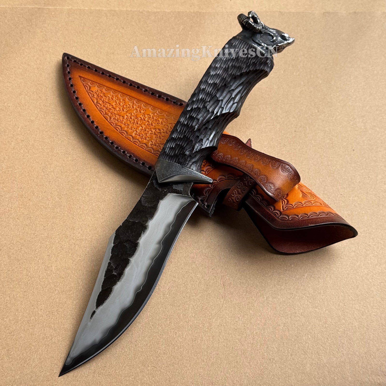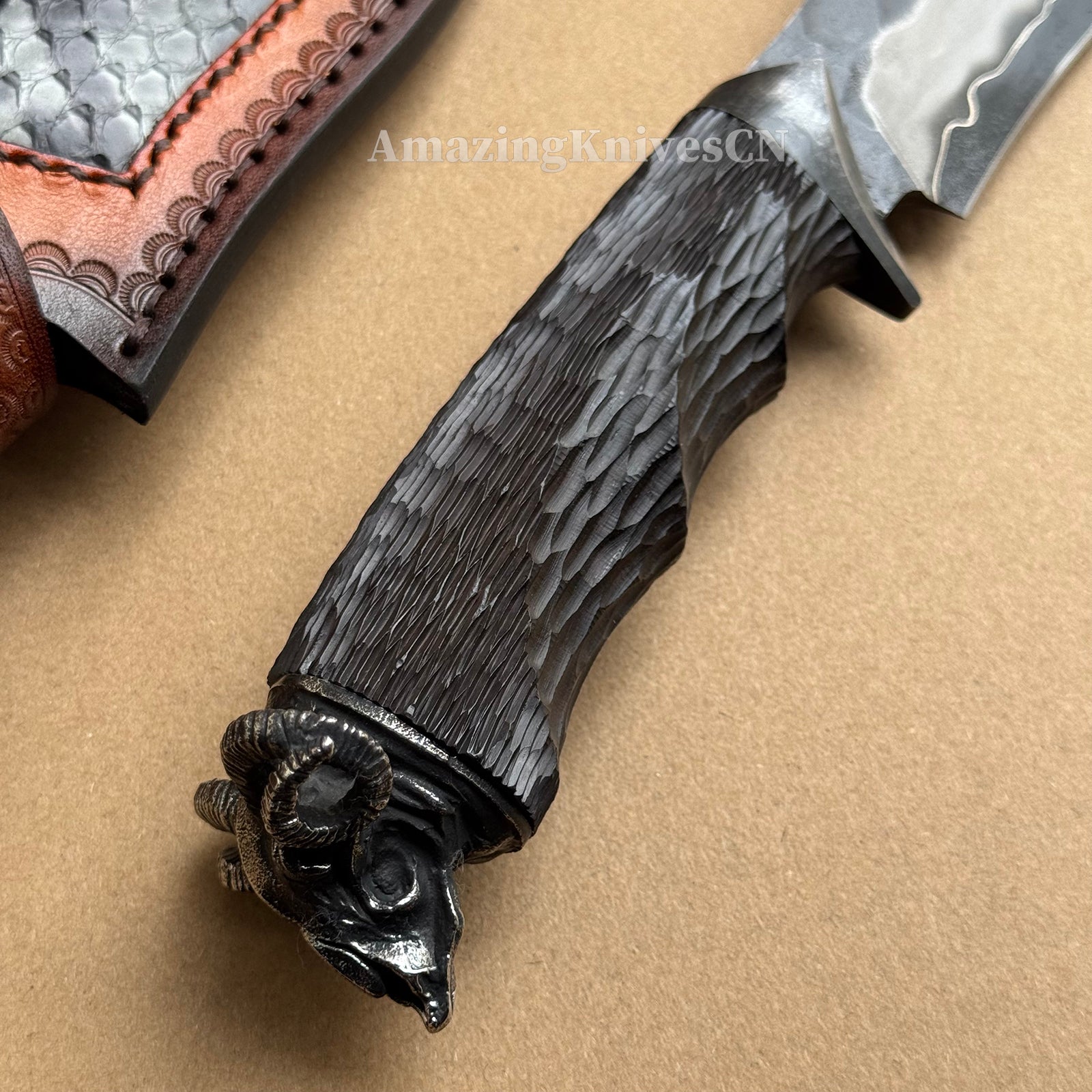 Forged Japanese San Mai Steel Hunting Knife Survival Knife Bowie Fixed Blade Black Goat Head - AK-HT0731