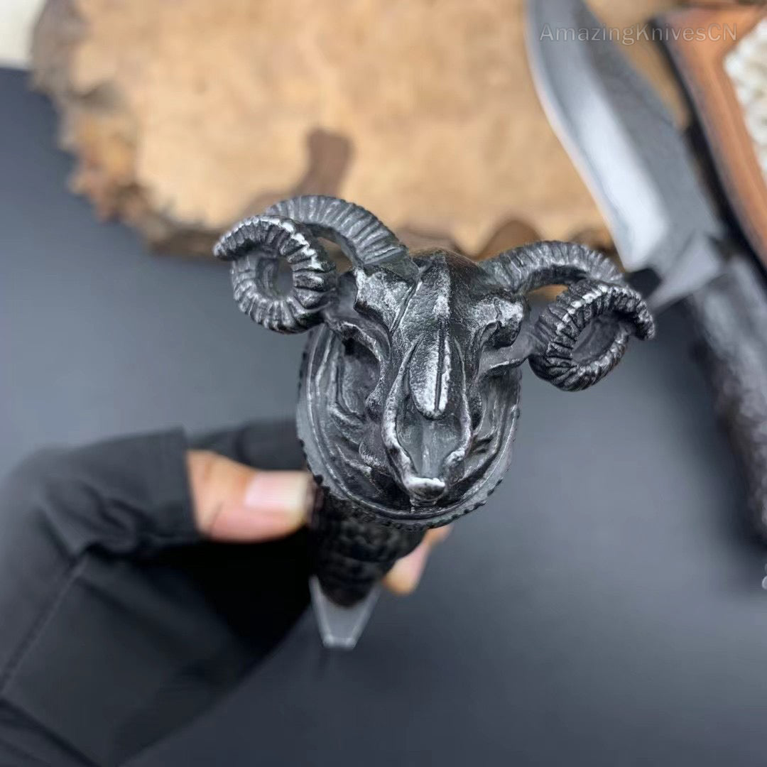 Forged VG10 Damascus Steel Hunting Knife Survival Knife Bowie Black Goat Head - AK-HT0731-D