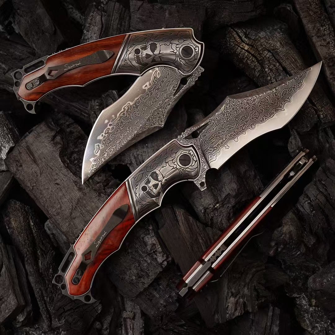 • Exquisite Craftsmanship: Designed over six months, the knife features handcrafted rosewood handle with skull and flame motifs, showcasing exceptional artisan work.