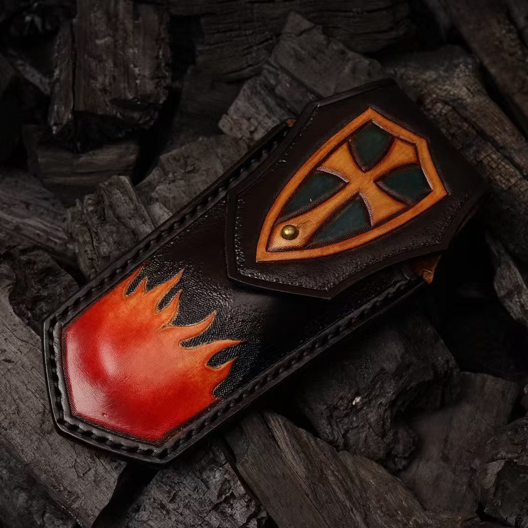 • Sheath: Handcrafted Italian vegetable-tanned leather sheath with hand-stitched, carved flame patterns matching the knife’s design.