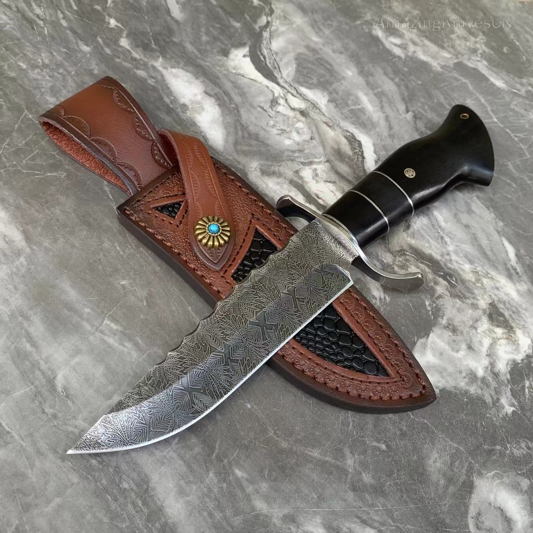 This premium hunting knife features a full-tang construction made of 9Cr18Mov steel, with deep cryogenic treatment for high hardness, rated at 60HRC. The handle is crafted from stabilized black ebony wood, reinforced with decorative brass pins for added durability. The blade is meticulously finished with stonewashed and etched engraving techniques, showcasing fine craftsmanship with 12 manual sharpening and secondary grinding processes, resulting in exceptional sharpness.