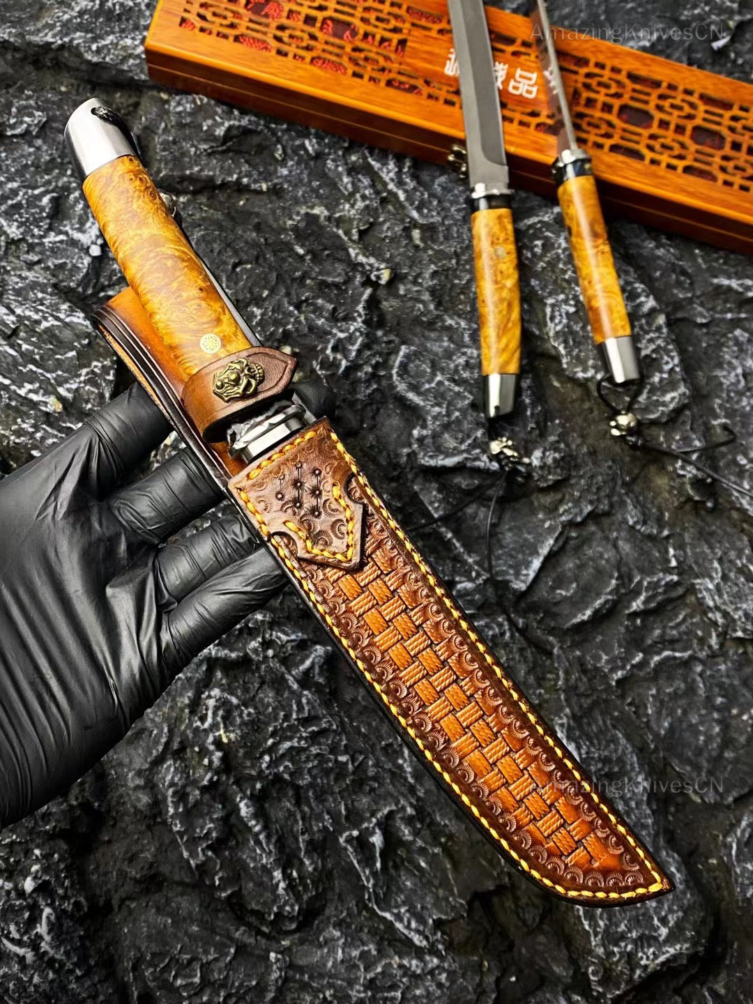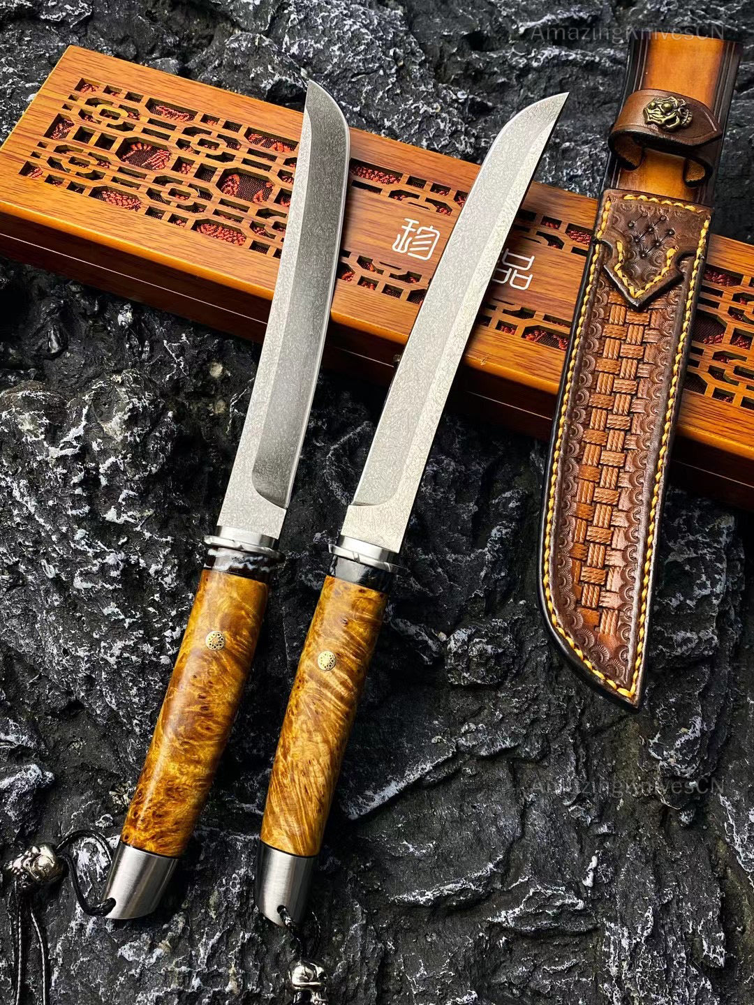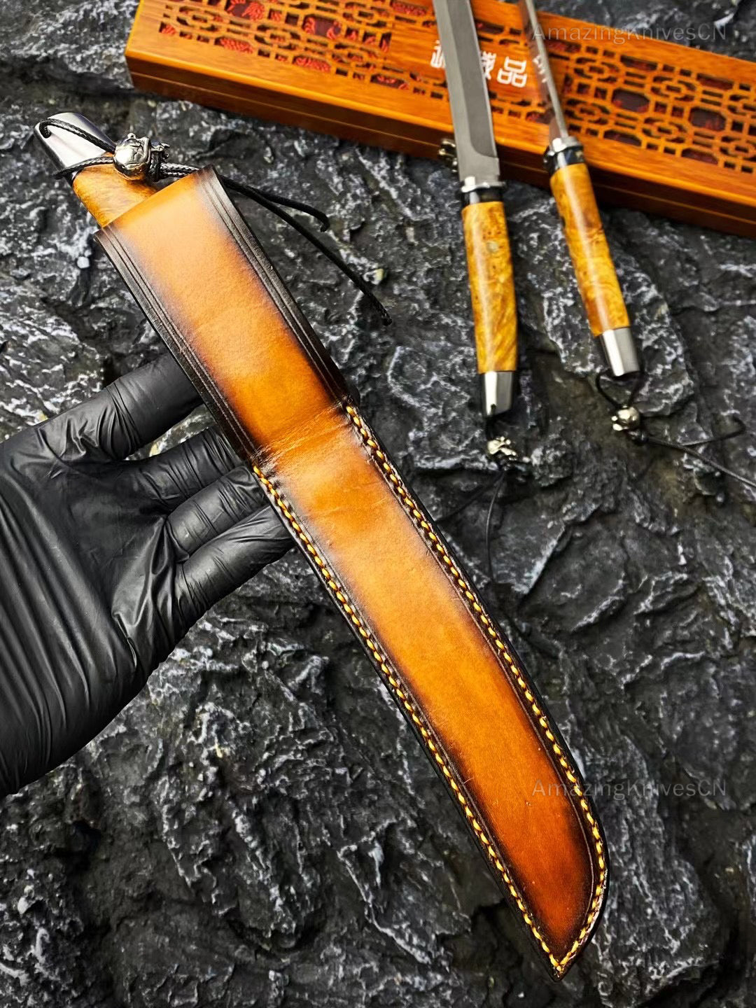 These knives and sheaths are handmaded. You will receive the knife that is like the one(s) in the photos, but the blade patterns and wood grains on handle may vary slightly.