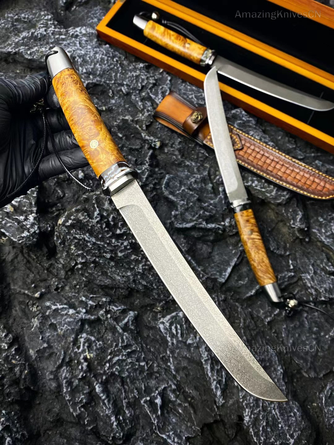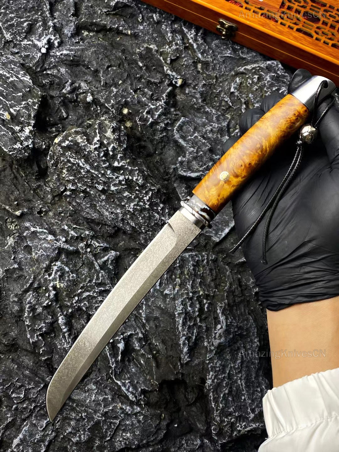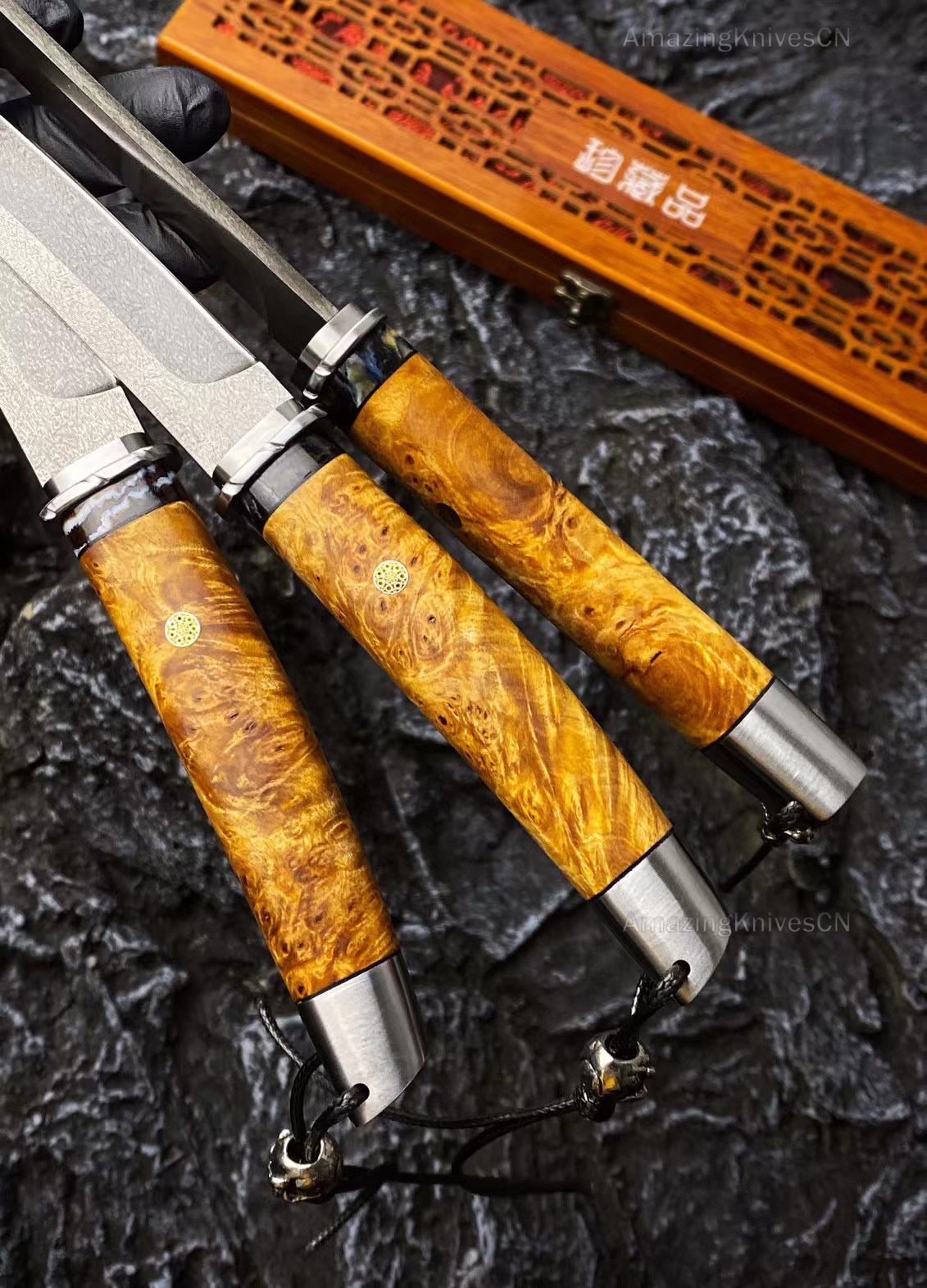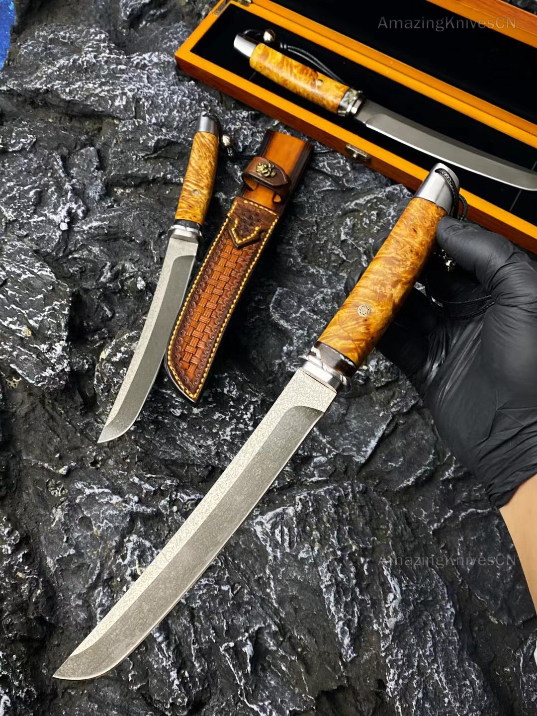 These knives and sheaths are handmaded. You will receive the knife that is like the one(s) in the photos, but the blade patterns and wood grains on handle may vary slightly.