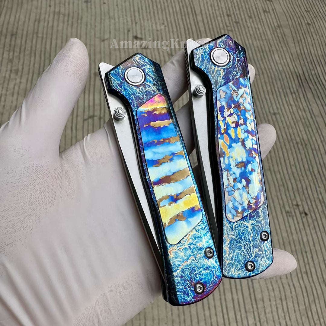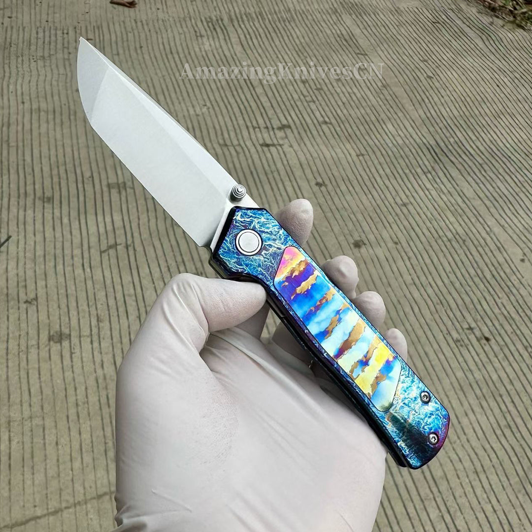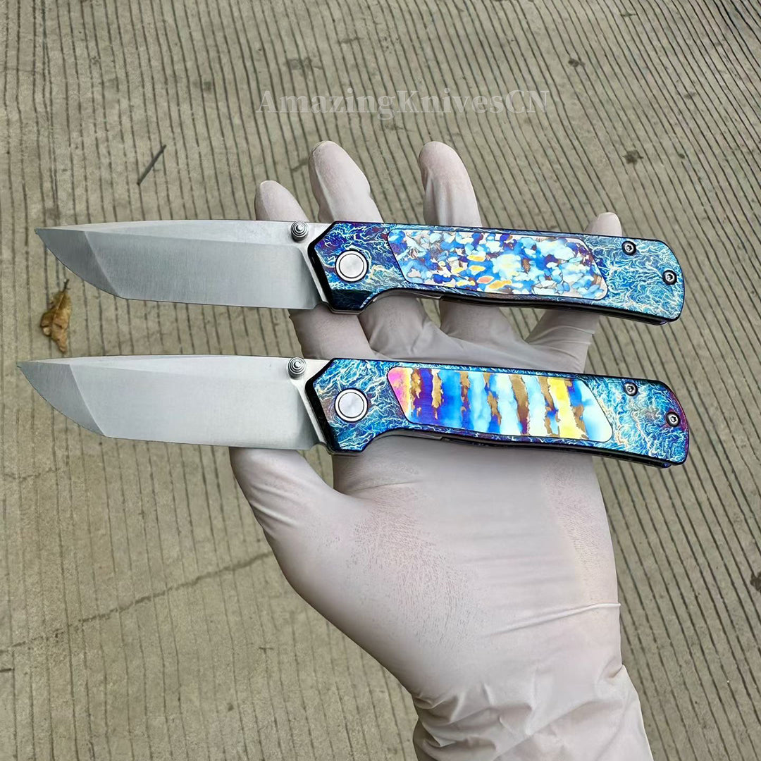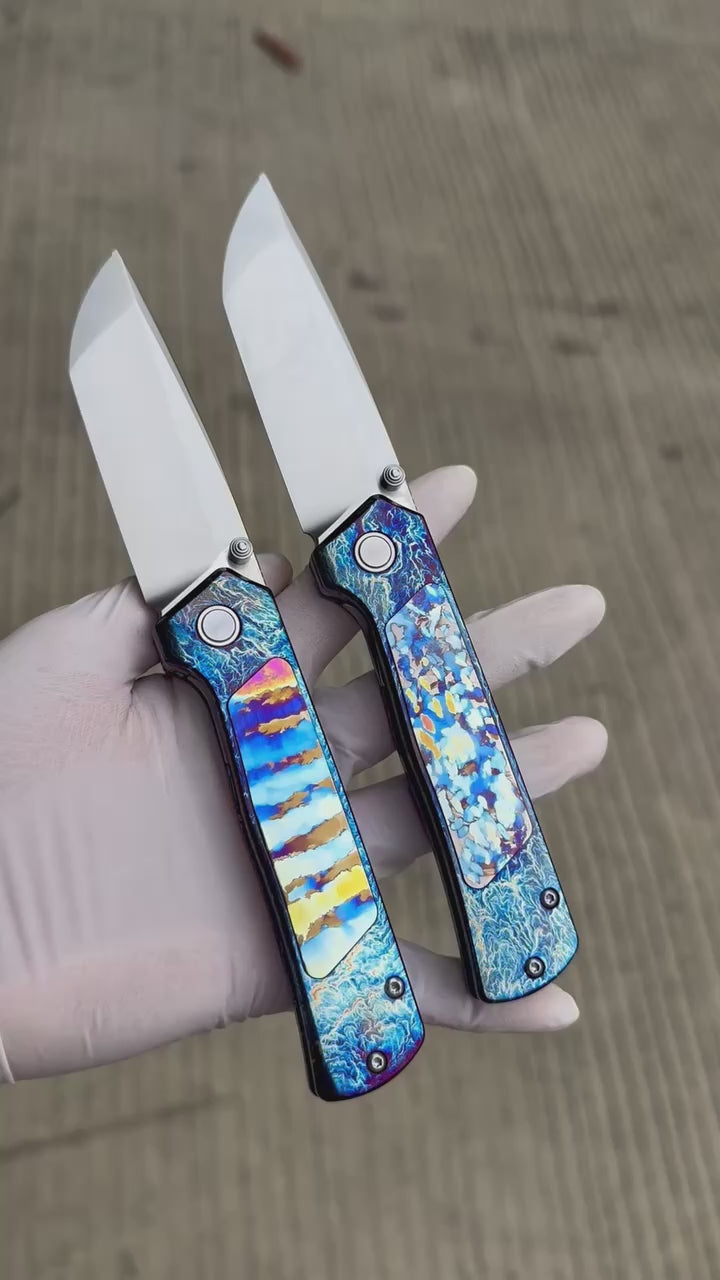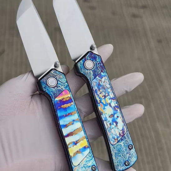 Handle material: Hand-blued finish with inlaid titanium sheet (unique pattern on each knife, shipped randomly)