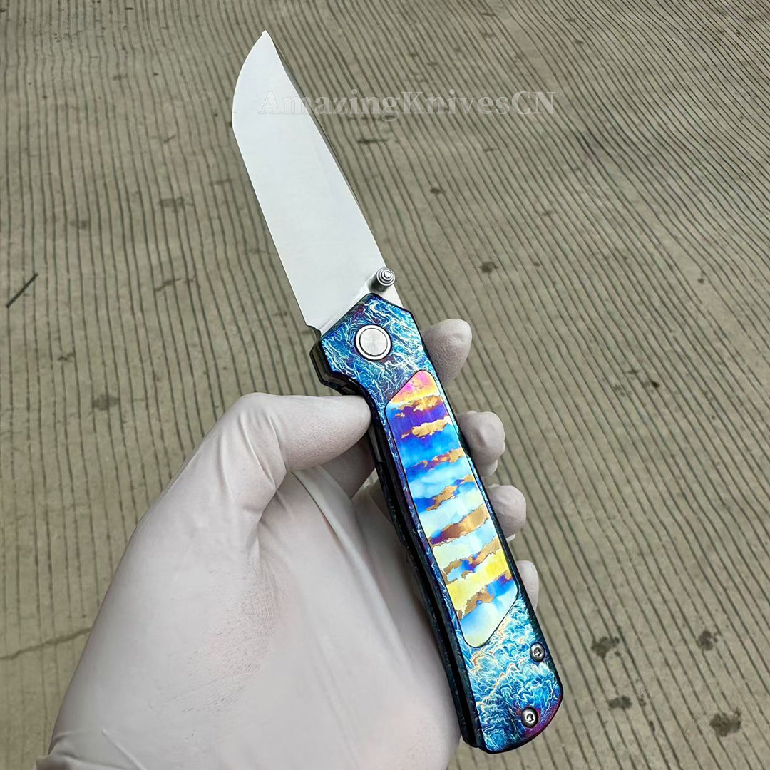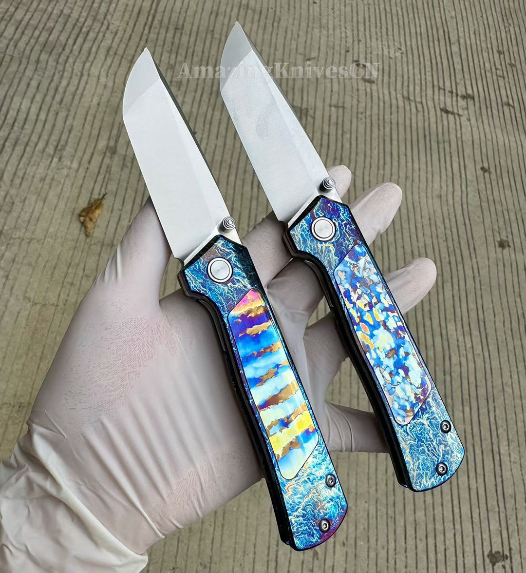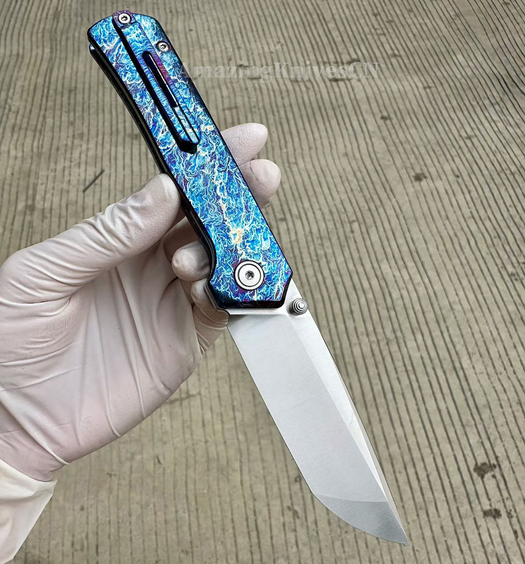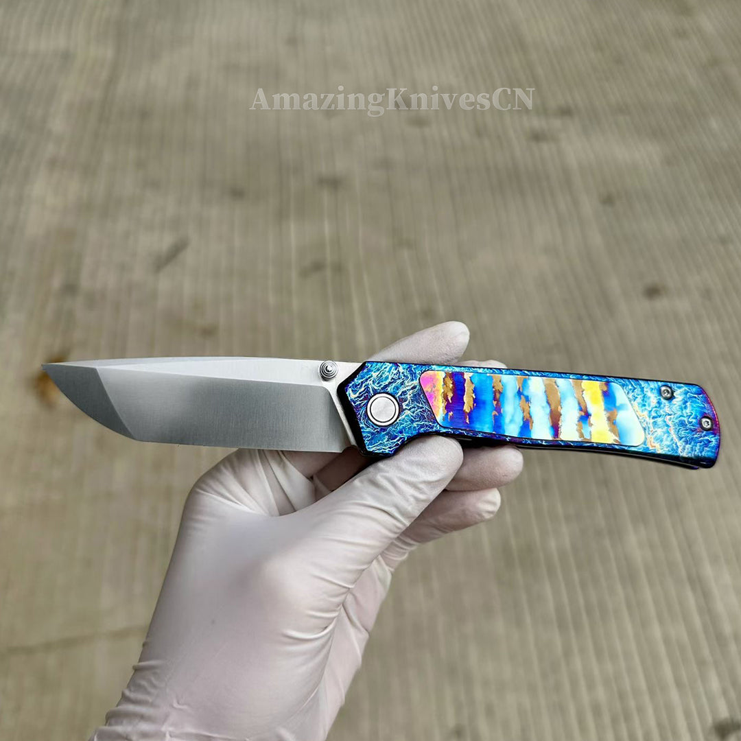Handle material: Hand-blued finish with inlaid titanium sheet (unique pattern on each knife, shipped randomly)