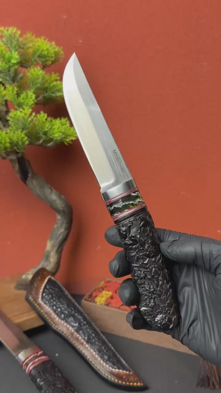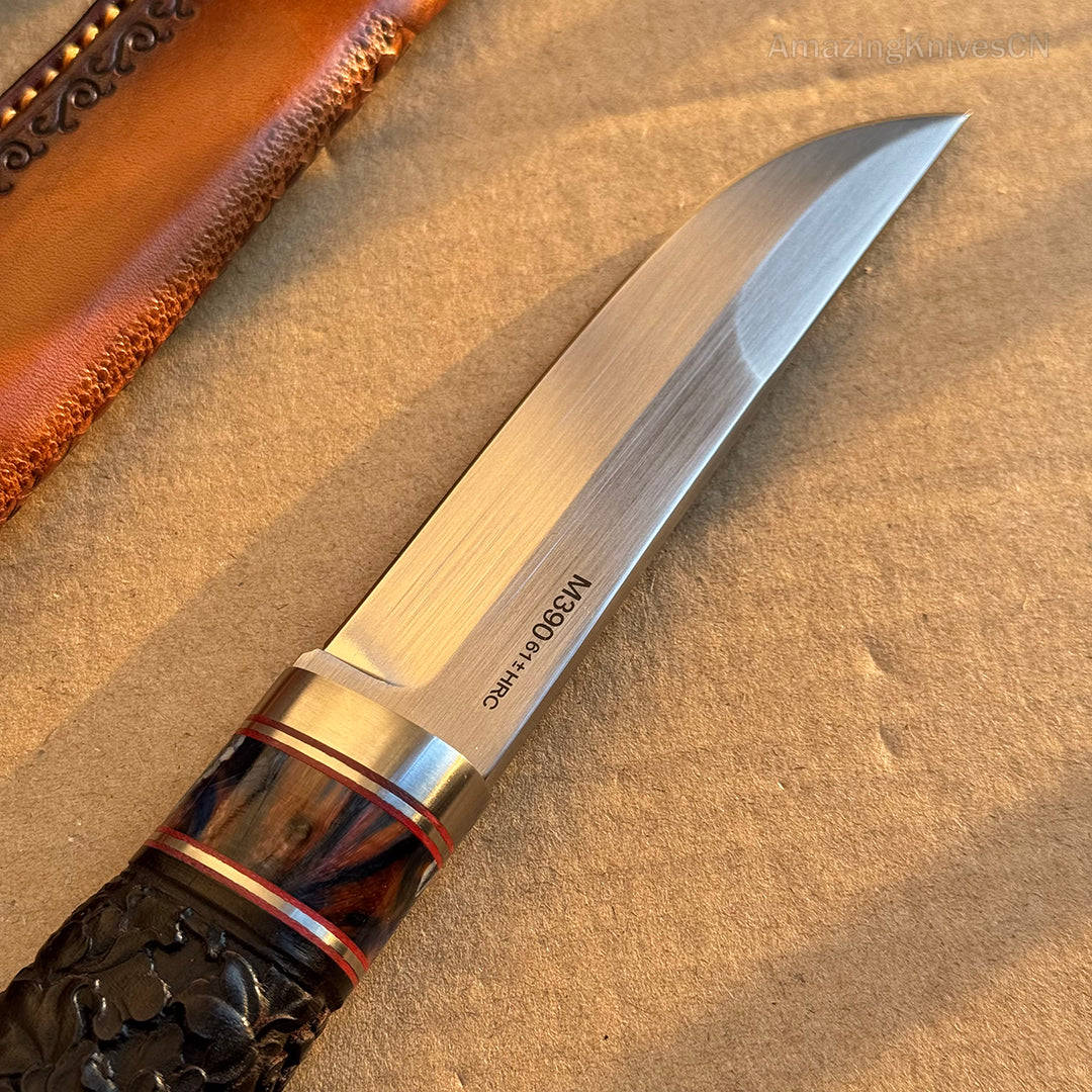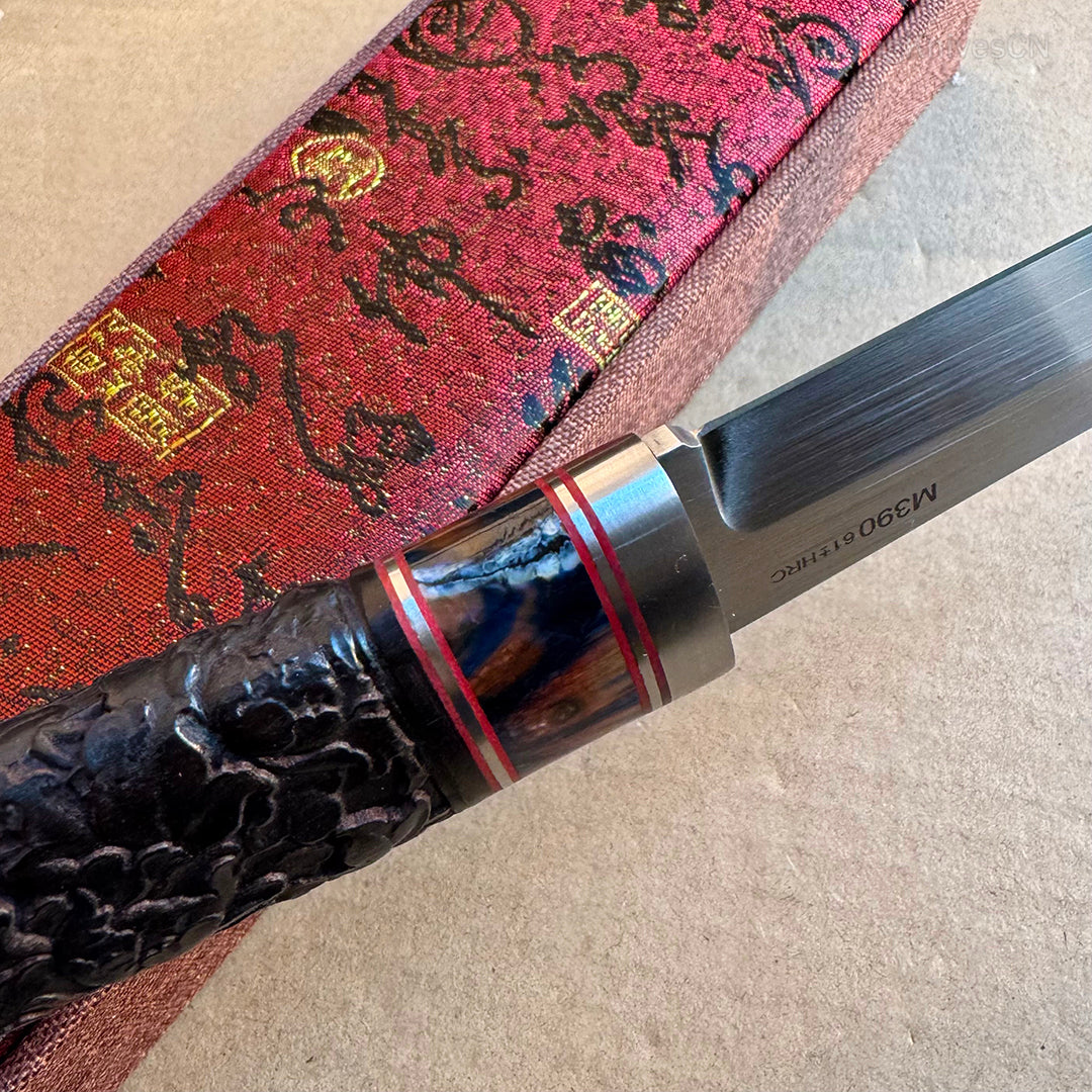 The blade is made from imported M390 powder steel, renowned for its superior quality. It undergoes precise vacuum heat treatment, achieving a hardness of 61-62HRC. The blade surface is meticulously hand-brushed, giving it a very high-end texture and appearance. The handle is inlaid with mammoth molar inserts and premium old ebony wood, featuring intricately hand-carved petal patterns. This combination ensures an excellent grip and ergonomic handling, providing a perfect balance in the hand.