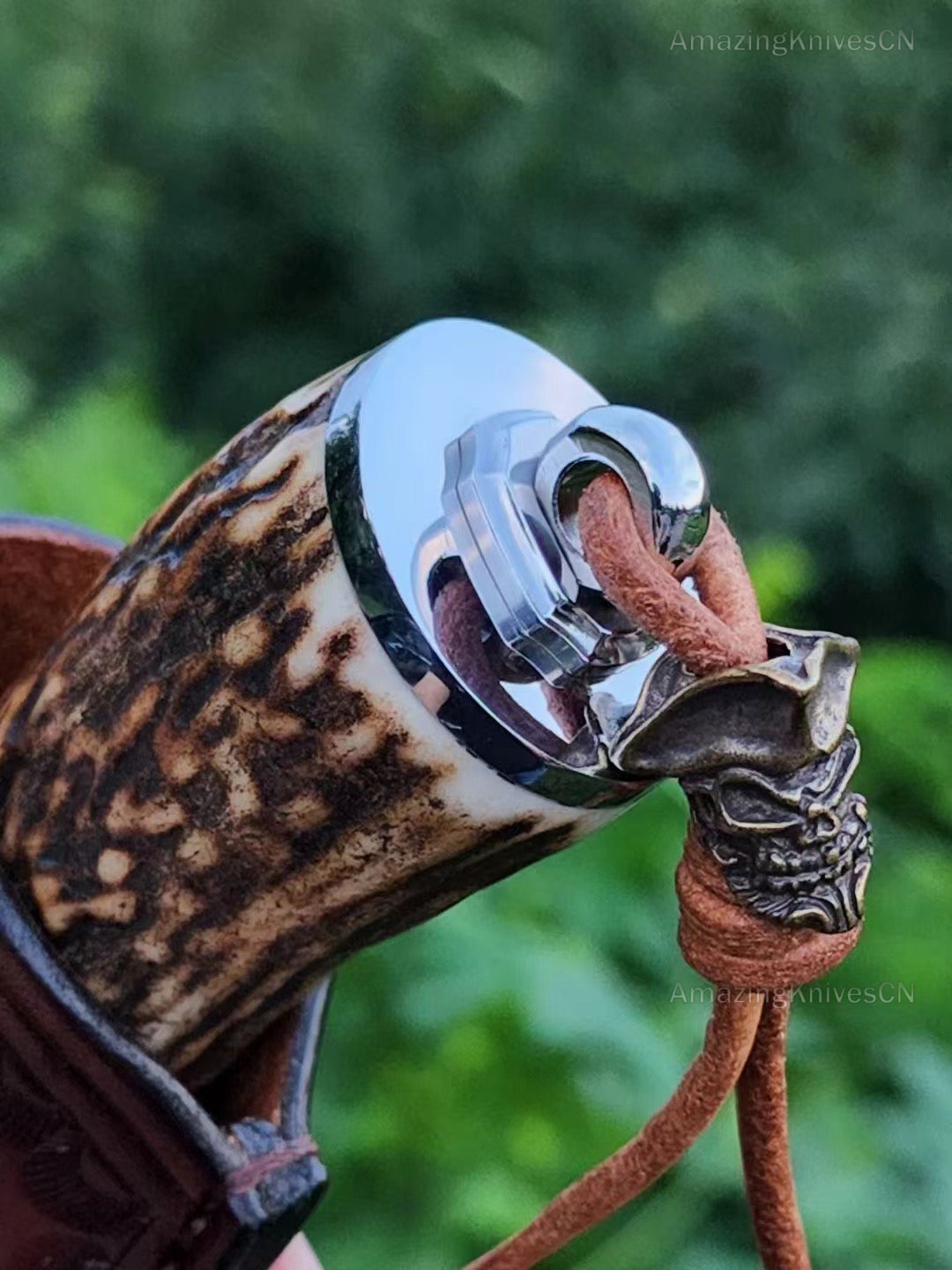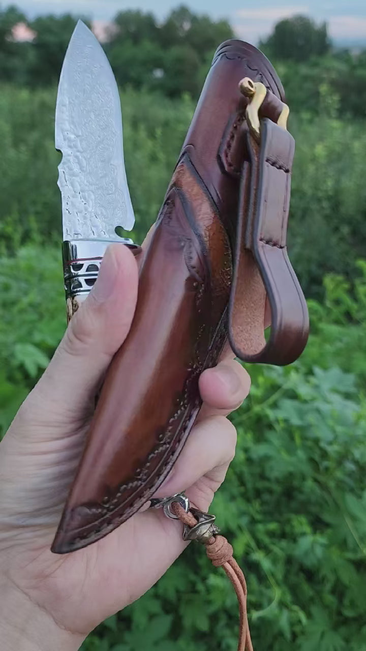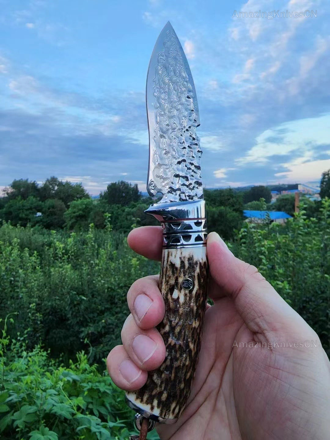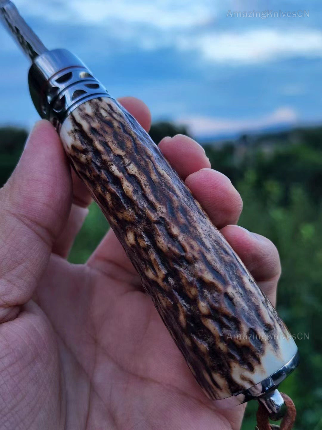 This hunting knife features a VG10 blade steel with Damascus forging and auspicious cloud pattern. The blade surface retains the rugged effect of forging, showcasing the natural steel craftsmanship. The knife guard is intricately carved with stainless steel using CNC technology and handcrafted detailing. The handle is meticulously crafted from natural antler, providing a warm and comfortable grip. The knife sheath is made of Italian vegetable-tanned leather, hand-stitched for durability. The overall design of the knife is sleek, resembling an eagle soaring high, while the natural antler handle offers a warm and ergonomic feel. Its textured surface provides excellent grip, making it suitable for everyday use and collector's admiration. Each knife is unique and represents a rare masterpiece.