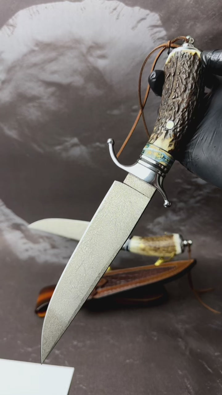 Crafted from a unique iron snowflake pattern wootz steel, boasting a hardness of 62-63HRC, and meticulously hand-finished by master craftsmen. The knife features mammoth fossil molar teeth paired with a naturally selected, aged deer horn handle. It comes with an imported Argentine vegetable-tanned leather sheath adorned with crocodile skin inlay, making it a high-end knife cover. Knife enthusiasts who understand the art of blades should not miss out on this opportunity. Whether for gifting or collecting, this knife is an excellent choice.